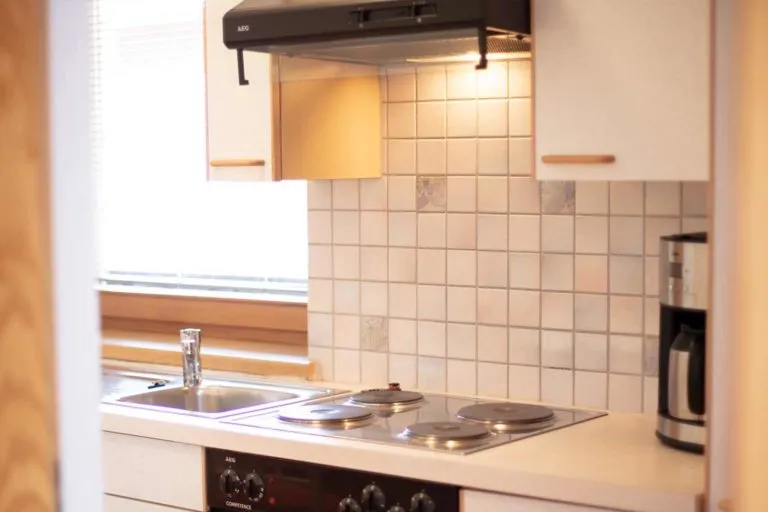 Küche oder Küchenzeilen mit Cerankochfeld, Backofen, Kühlschrank, Geschirrspüler inkl. Tabs, Wasserkocher, Kaffeemaschine, ausreichend Geschirr und Besteck.